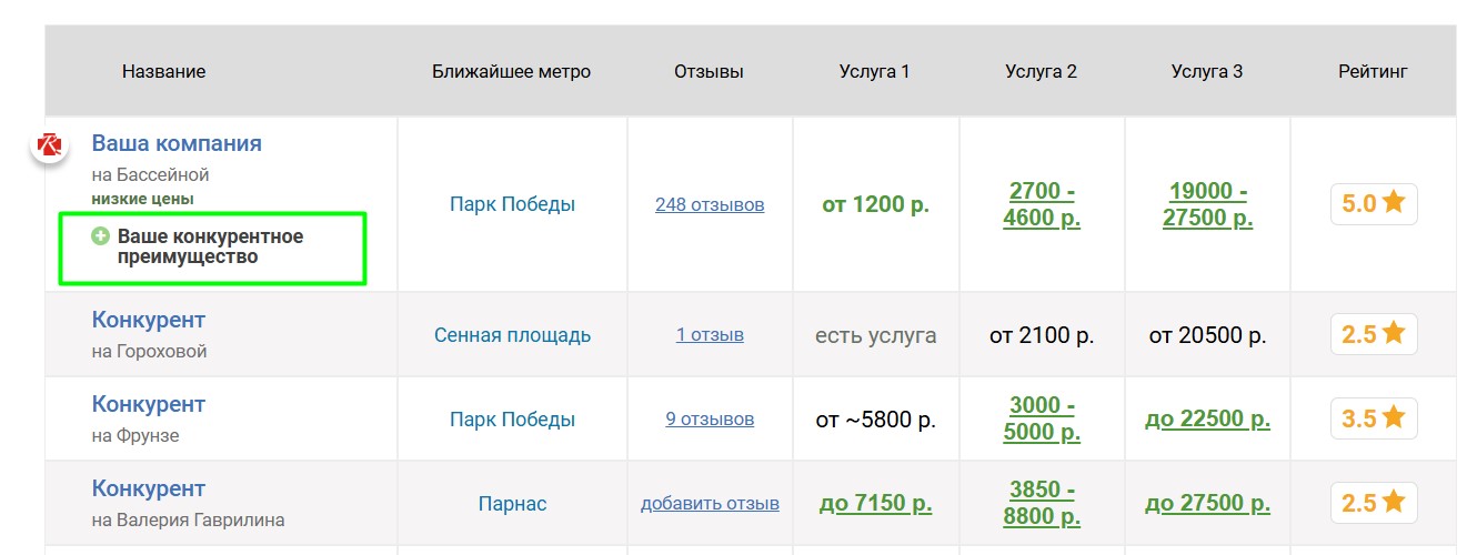Вокруг продвигаемой таким образом клиники выбирается некоторое количество ближайших конкурирующих клиник, продвигаемая клиника попадёт к ним в таблицу «Сравнение по ценам», которая выглядит следующим образом: